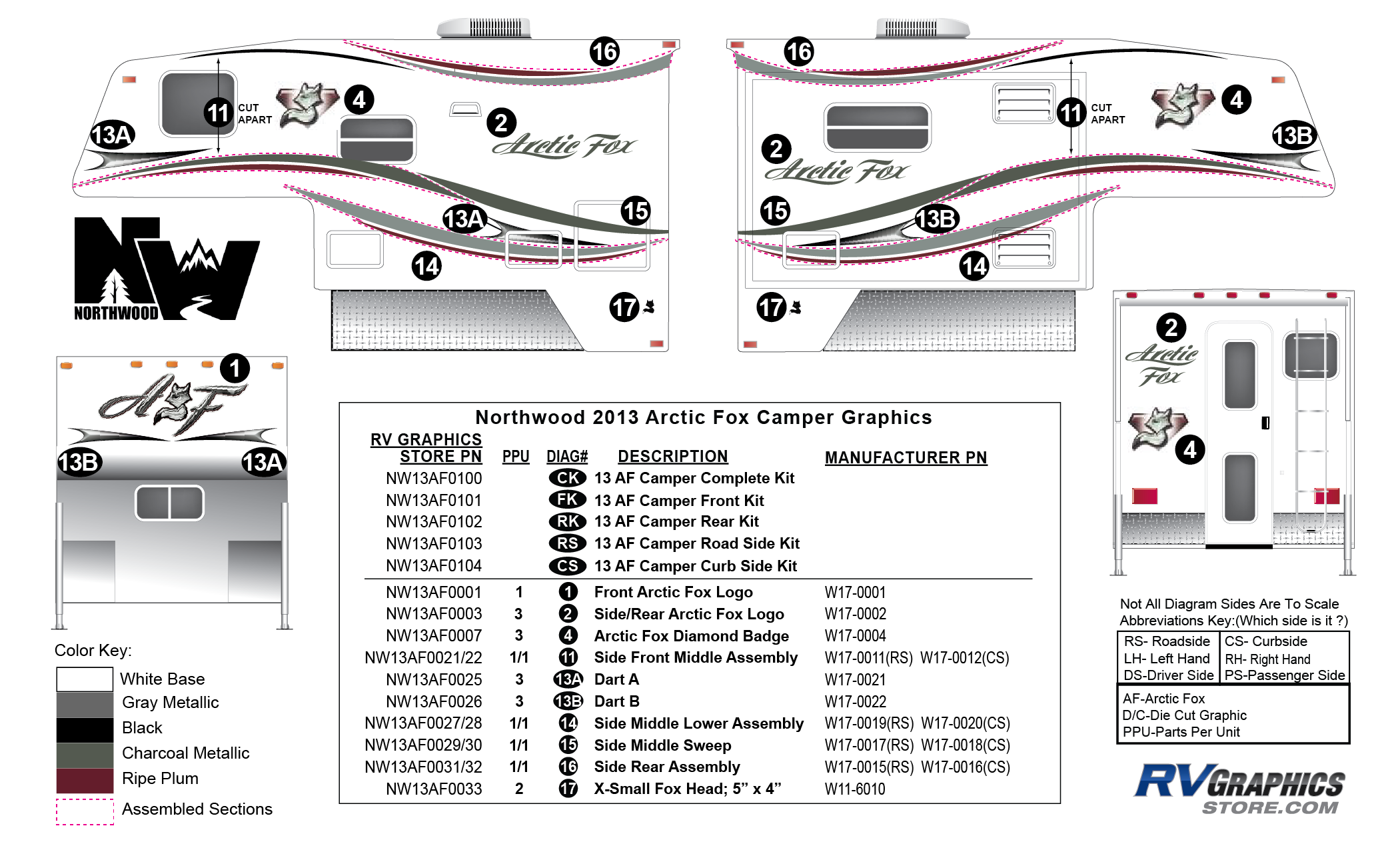 Description: 9 piece 2013 Arctic Fox Camper Right Side Graphics Kit Bullet Number:   CS Color:   4 Base Colors Height (inches):   18.8 Length (inches):   124 Adhesive Type...