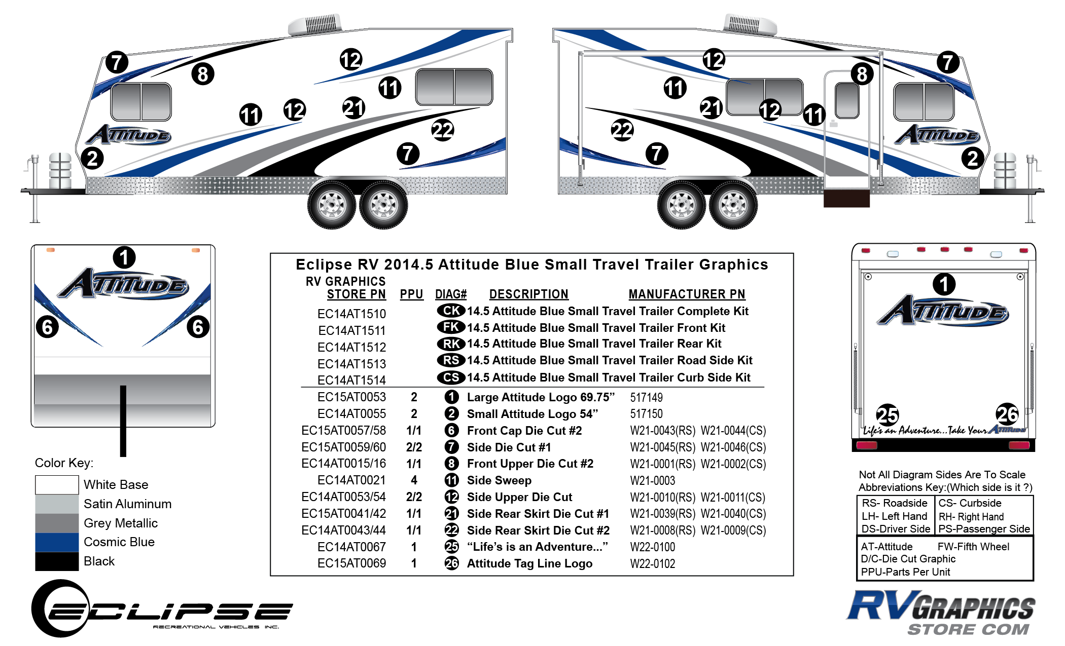 26 Piece 2014.5 Attitude Sm TT Complete Graphics Kit Bullet Number:   CK Color:   5 Base Colors Height (inches):   25 Length (inches):   165 Adhesive Type Pro...