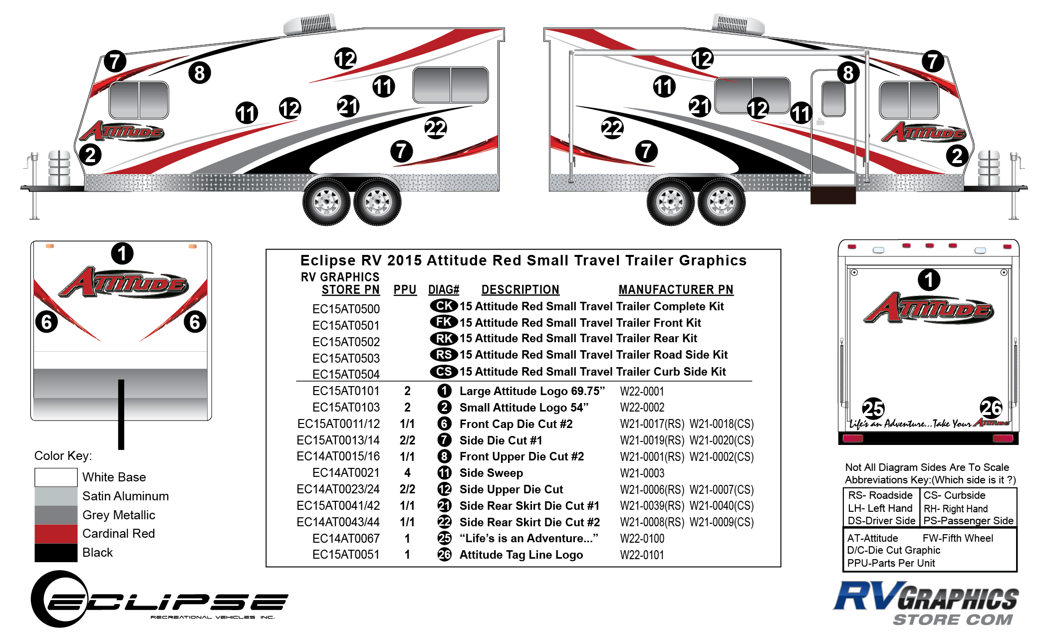 Description: 26 Piece 2015 Attitude Sm TT Complete Graphics Kit Bullet Number:   CK Color:   5 Base Colors Height (inches):   25 Length (inches):   165 Adhesive Type...