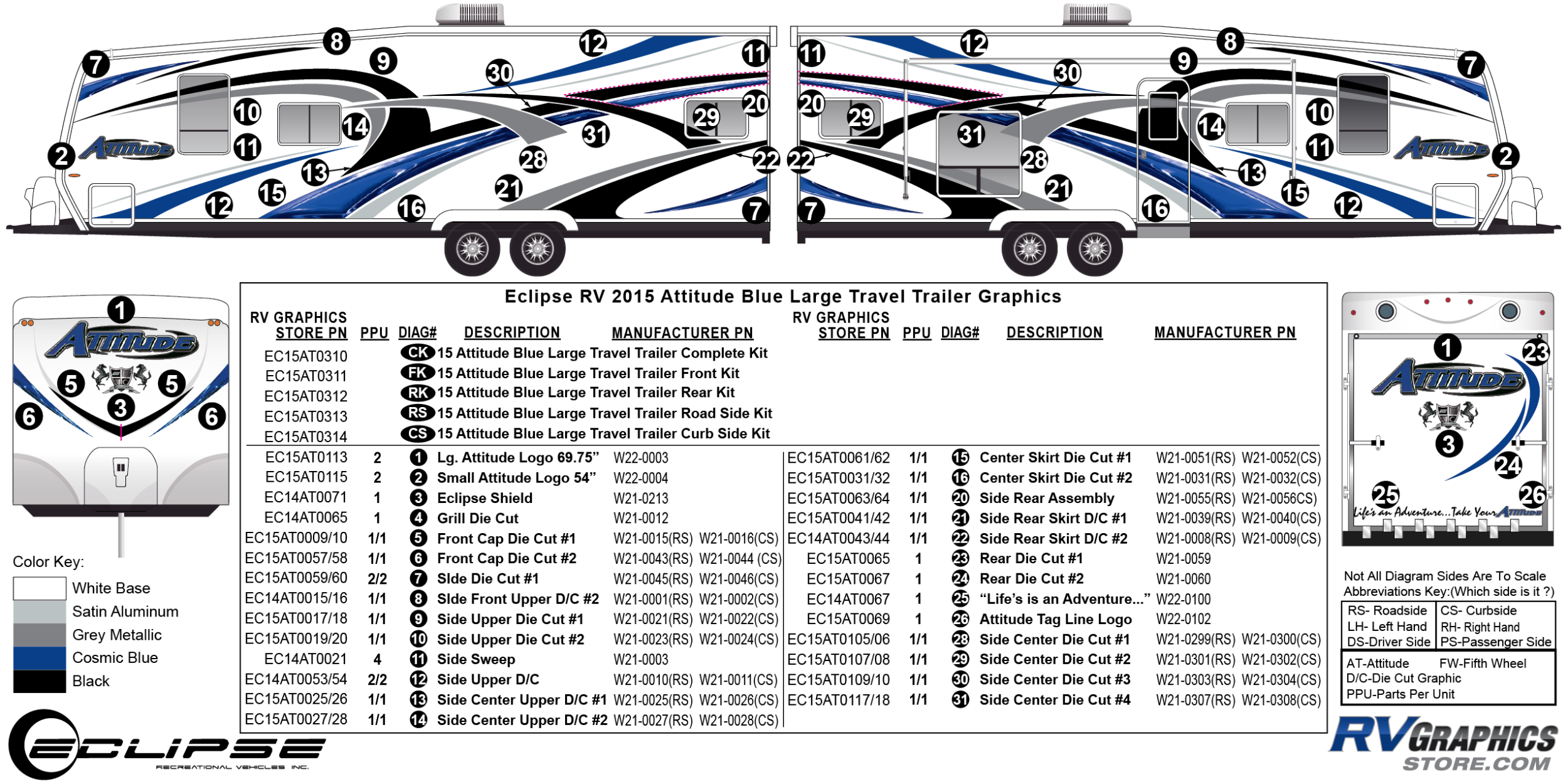 14 Piece 2015 Attitude 26 ft. TT Left Side Graphics Kit Bullet Number:   RS Color:   5 Base Colors Height (inches):   25 Length (inches):   165 Adhesive Type ...