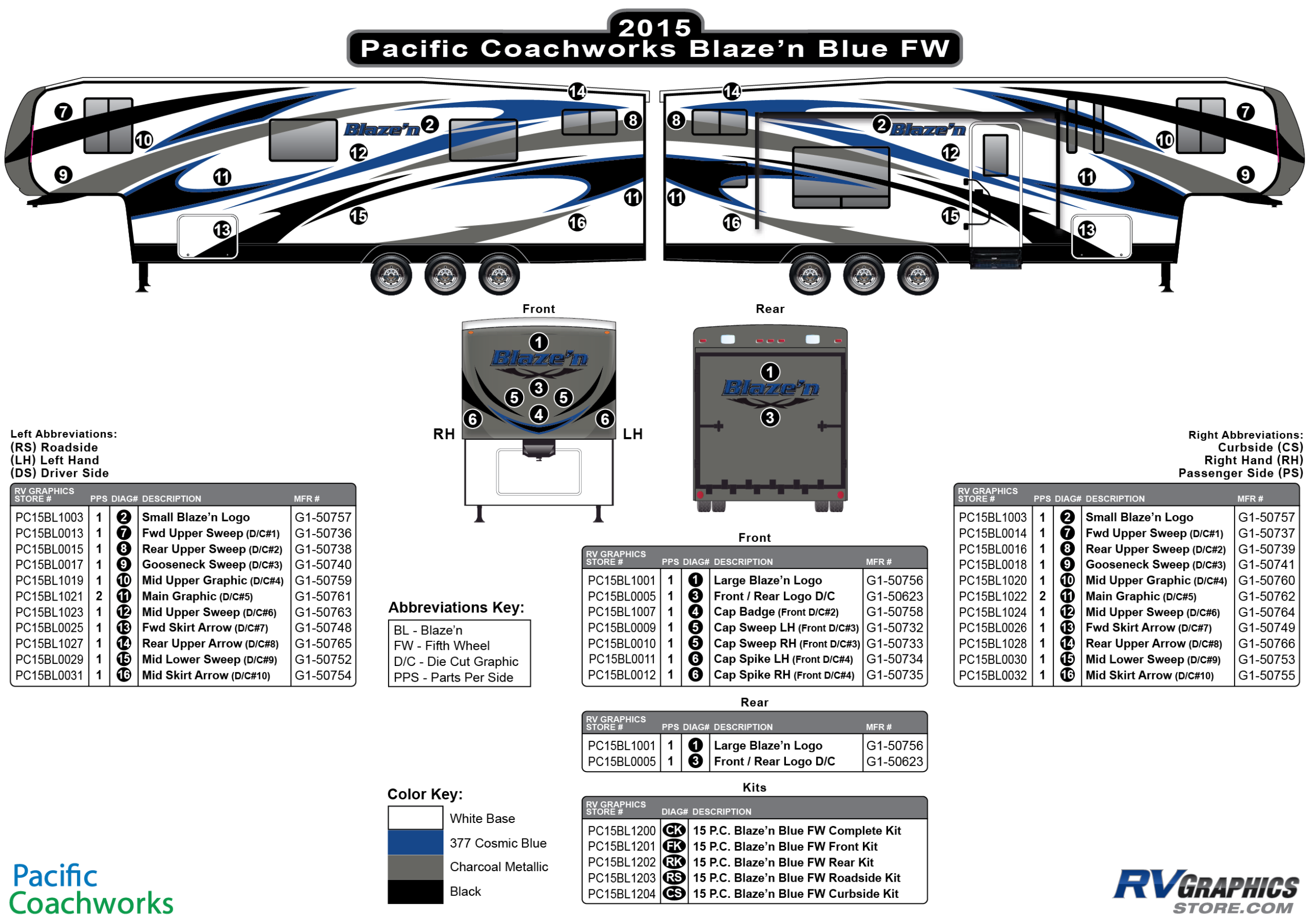 12 Piece 2015 Blaze'n Blue Fifth Wheel Curbside Graphics Kit