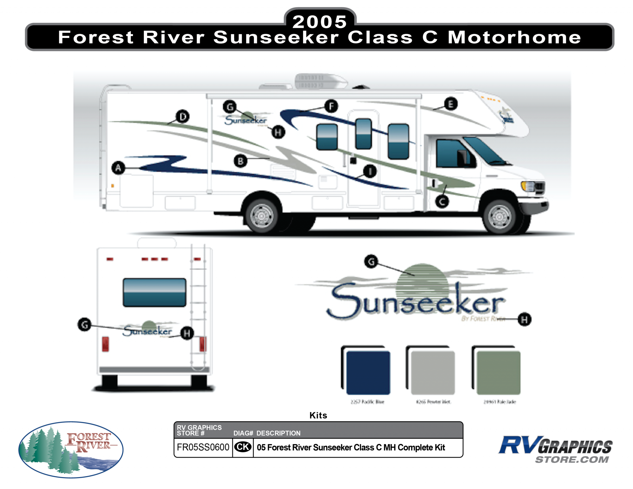 22 Piece 2005 Sunseeker Class C Complete Graphics Kit Bullet Number: CK Color: 4 Base Colors Height (inches): 30 Length (inches}: 200 Adhesive Type Provided: Comply...