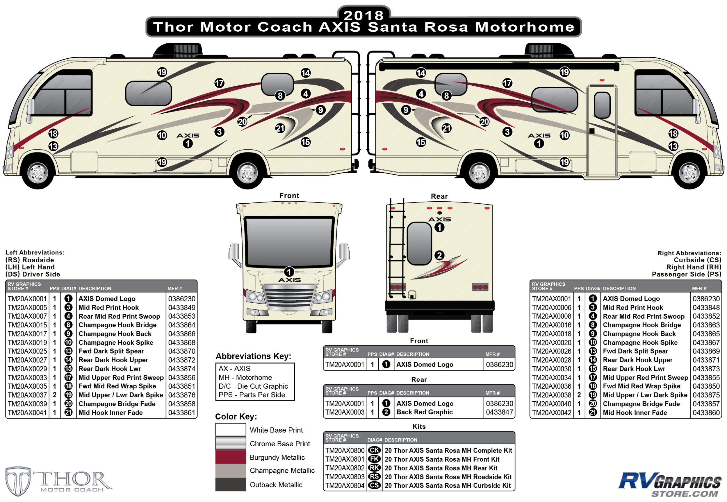Description: 2020 Axis RV Graphics Complete Kit Bullet Number: CK Color: 33 Piece 2020 Axis Motorhome Red Version Complete Graphics Kit Height (inches): 28.9 Length (inches}: 134.3...More Details »
