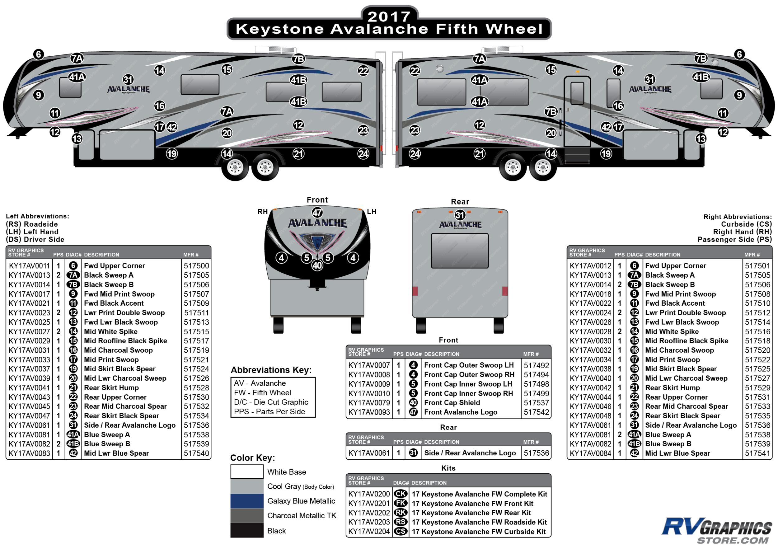 Description: 2017 Avalanche RV Graphics Complete Kit Bullet Number: CK Color: 4 Base Colors Height (inches): 23.7 Length (inches}: 113.1 Adhesive Type Provided: Controltac Paper...More Details »