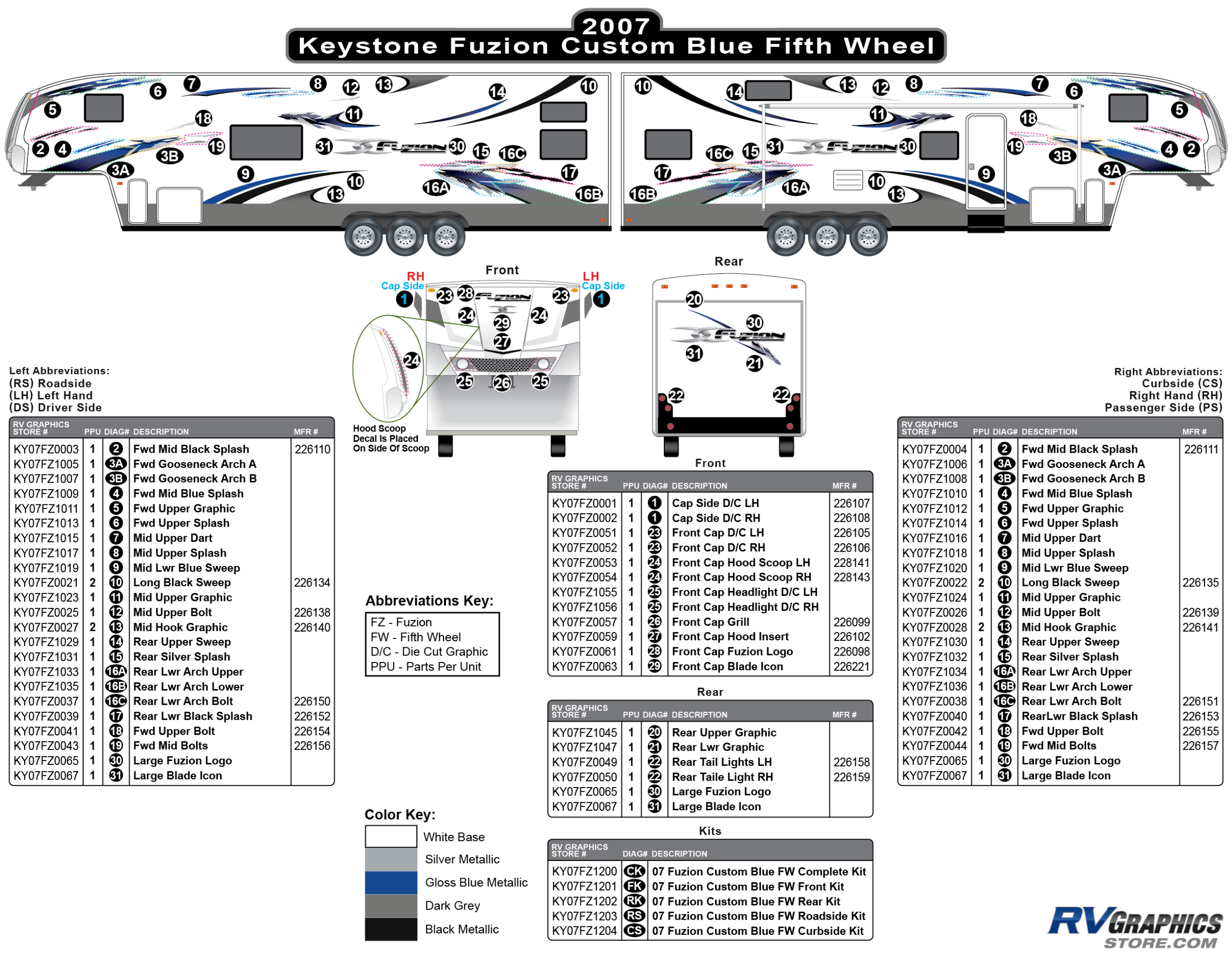 68 Piece 2007 Fuzion Fifth Wheel Complete Graphics Kit-CUSTOM BLUE