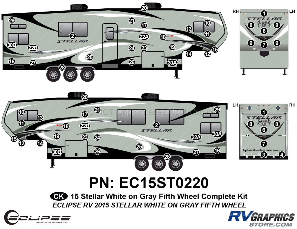 62 Piece 2015 Stellar Fifth Wheel White on Gray Version Complete Graphics Kit