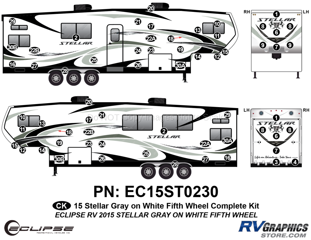 62 Piece 2015 Stellar Fifth Wheel Gray on White Version Complete Graphics Kit