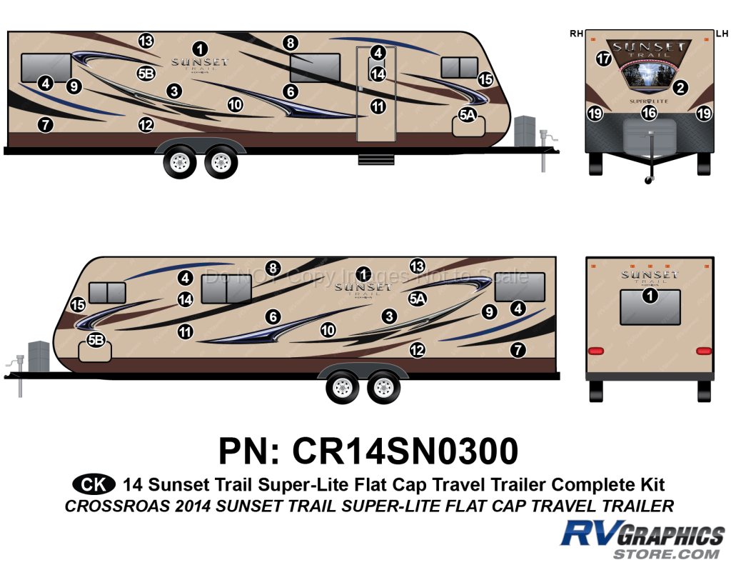 38 Piece 2014 Sunset Trail Flat Cap Travel Trailer Complete Graphics Kit